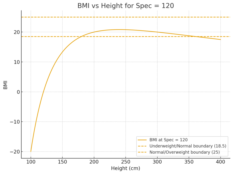結論としては、スペ120を最も達成しやすいのは身長240cmの人で、スぺ120でも健康的と言えるのは身長180-360cmの人、となります。