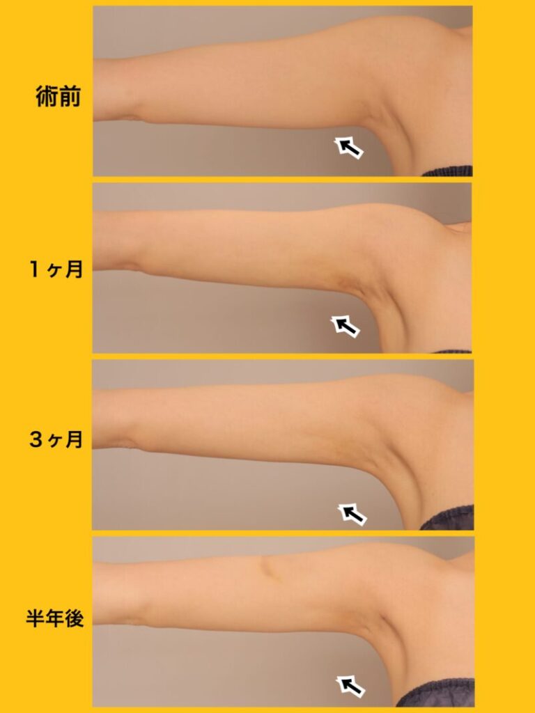 完全時系列でお見せします。腕の「後ろ側」の細さに技術力の差がでます。お任せください。~25歳172cm52kg上腕肩脇肉900cc吸引後完全時系列(1,3, 6ヶ月)~(2026年2月11日)