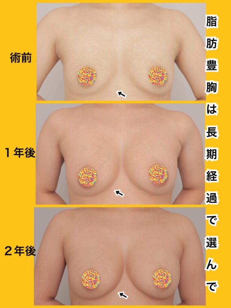 脂肪豊胸よしえ先生です。1年後、2年後の長期経過をお見せします。大きさはずっと続きます。