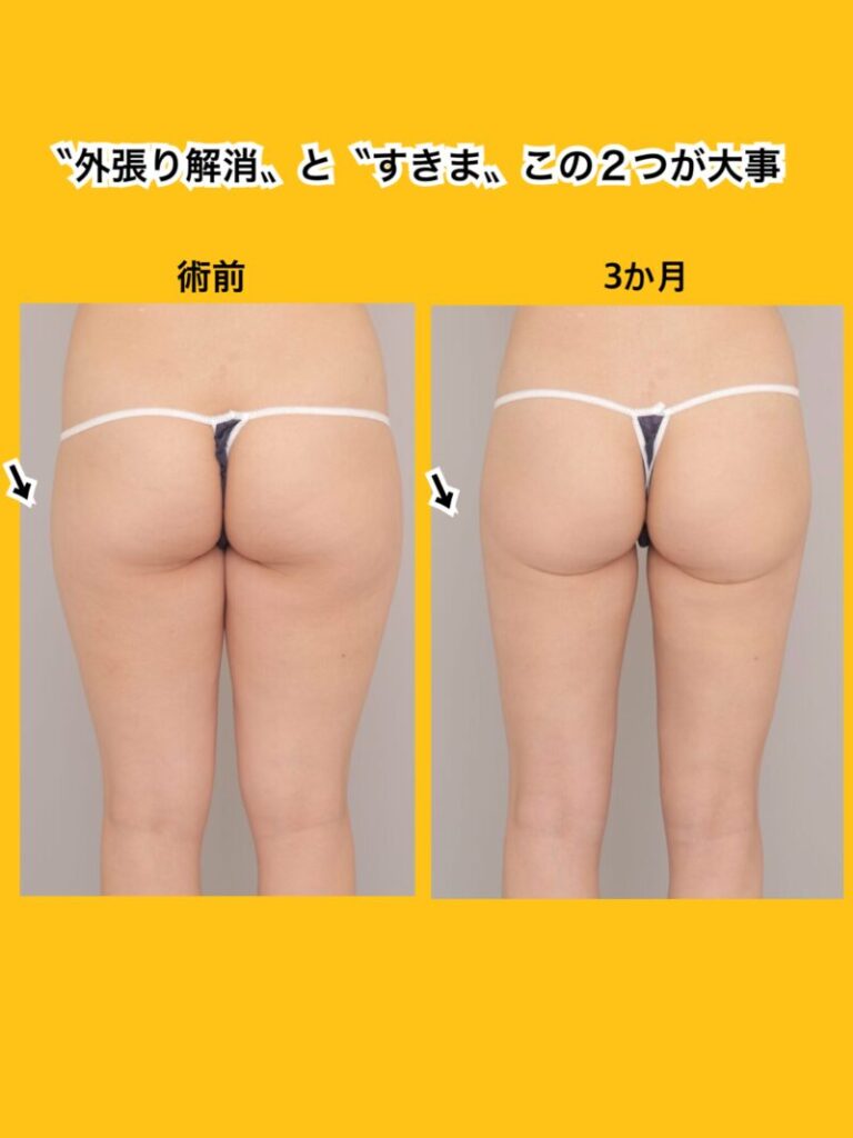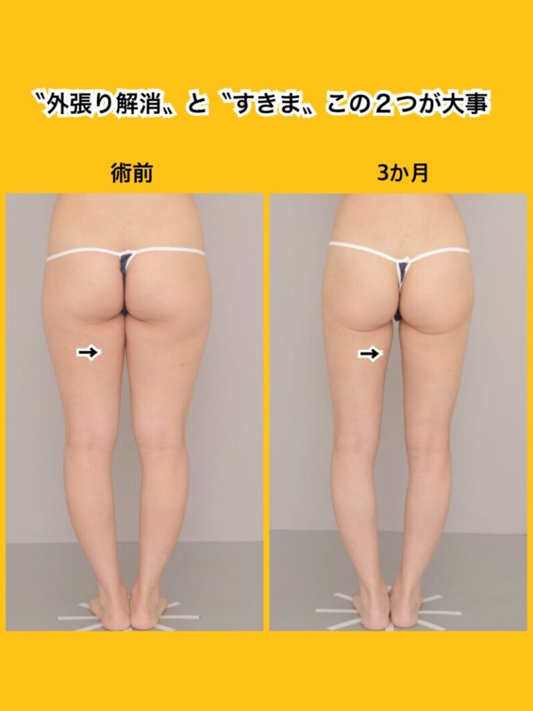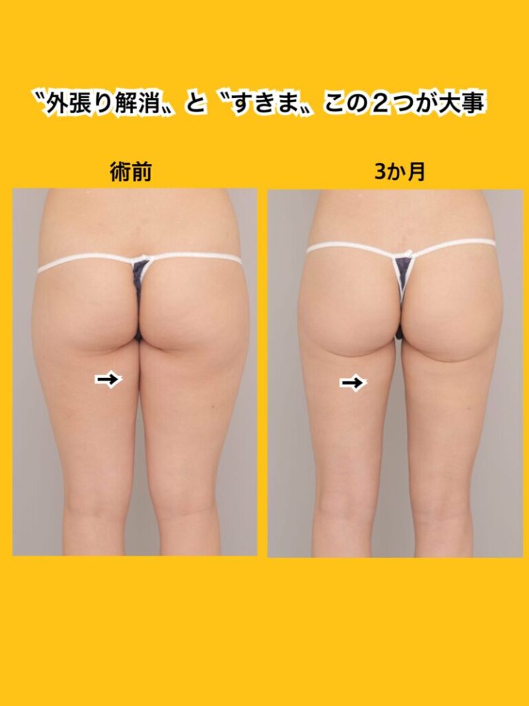 「お尻の横幅まで」細くするのが吉江式。太ももの外張りをなくして脚長効果も!~31歳153cm52kg大腿全周膝臀部2300cc吸引後半年~